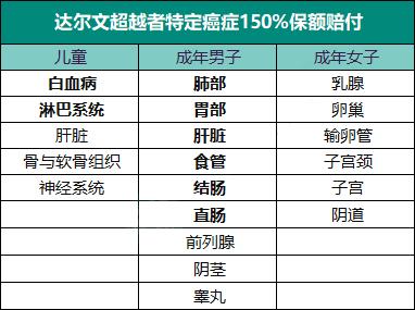 特定癌症保障,男性9种、女性6种、儿童5种特定癌症,首次理赔按150%保额赔付。