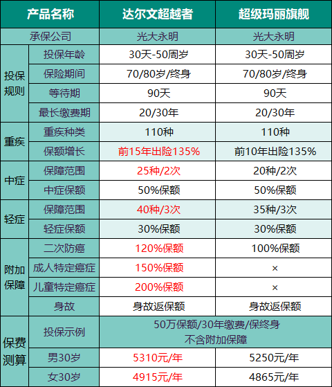 对比可见,两款产品的保障规则一模一样,毫无变化。达尔文超越者比超级玛丽旗舰版多了几项保障,价格略有提高。
