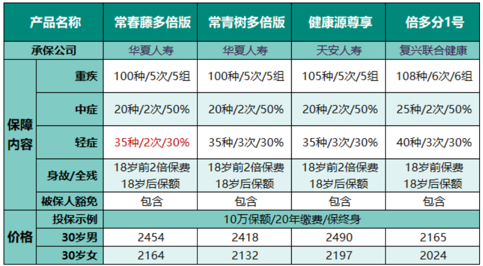 常春藤多倍版和同一家的常青树多倍版非常相似,但轻症赔付次数偏弱,价格偏高,条款也不如对方,完全输给了自己人。