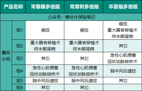 对比看出,常春藤和常青树多倍版的情况一致,重疾分组合理,癌症单独一组,其它5种重疾分在另外3组。而华夏福多倍版就比较坑了。