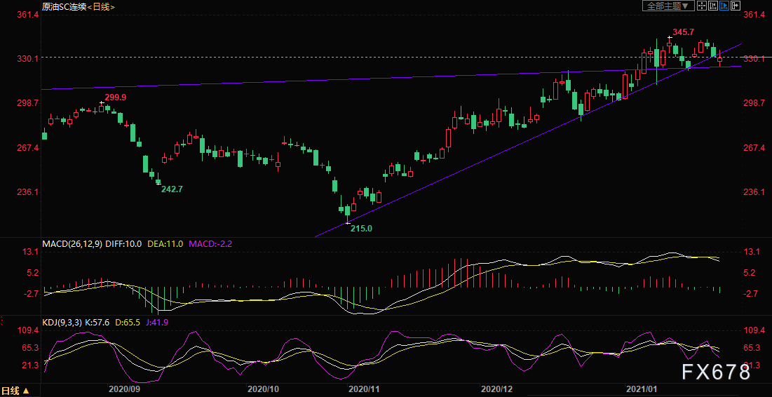 上海原油价格下跌,主力合约2103终盘收于332.1元/桶,跌5.3元/桶,跌幅1.57%。