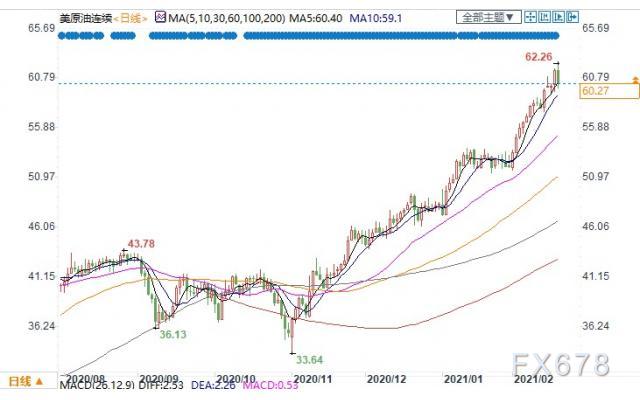 美国WTI 4月原油期货电子盘价格周三(2月24日)收盘上涨1.78美元,涨幅2.89%,报63.45美元/桶。油价周三攀升至13个月新高,此前美国政府数据显示,上周原油产量下降,因原油生产在遭遇极寒天气后中断。