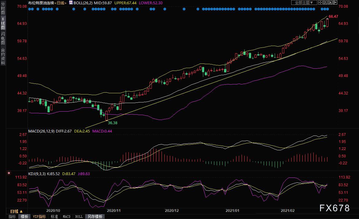 整体来看,K线图显示油价上涨动能仍存,基本面多重利好支撑,在下周OPEC+会议前,市场仍偏向多头,油价存在进一步冲高机会,美原油关注66整数关口附近阻力;但投资者也需要提防OPEC+产油国将讨论从4月起小幅放松石油供应限制的利空影响,可能会引发多头获利了结。