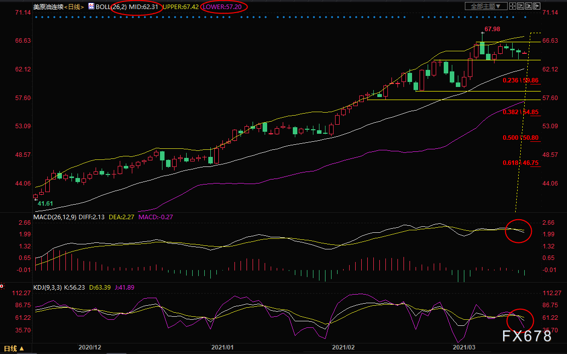 日线级别:高位震荡;MACD顶背离后死叉运行,KDJ高位死叉运行,油价短线仍有较大的下跌风险,初步支撑仍在63.81附近,隔夜低点和2月25日高点支撑都在该位置附近,强支撑在布林线中轨62.31附近,若失守该支撑,则增加后市看空信号。