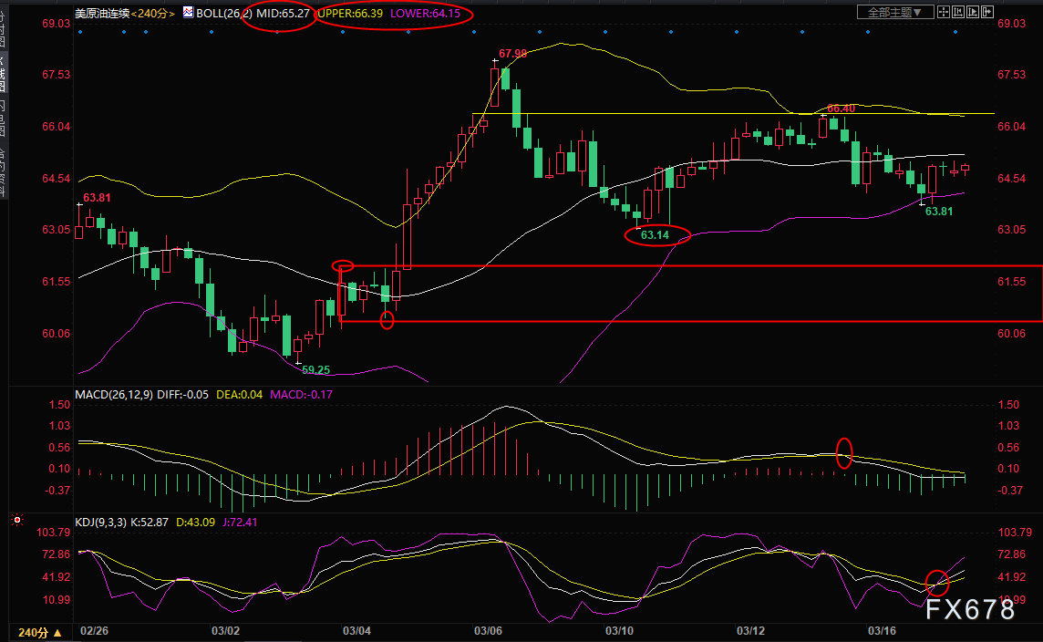 4小时级别:震荡;布林线轨道接近水平运行,继续关注布林线区域的突破情况,目前在64.15-66.39区域,由于布林线下轨给油价提供支撑,KDJ重新结成金叉,短线油价有机会重新试探布林线上轨66.39附近阻力,若顶破66.39附近阻力,则有望启动新一轮涨势。