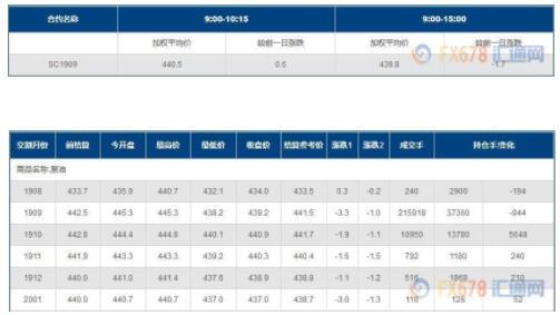 上海原油价格下跌。主力合约SC1909,以439.2元/桶收盘,下跌3.3元,跌幅为0.75%。全部合约成交228526手,持仓增加5012手至57652手。主力合约成交215918手,持仓减少944手至37360手。