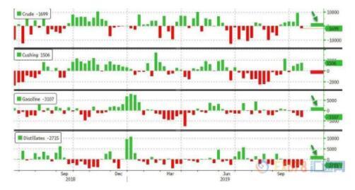 上图为:10月25日当周API原油库存数据概览(注:右边数字为刻度,不是数据)