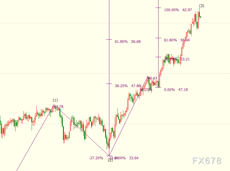 日线图上看,NYMEX原油自47.18美元开启的上行3浪走势可能在其100%目标位62.97美元附近,并就此迎来回调4浪走势,下方目标位看向3浪85.4%目标位60.67美元和76.4%目标位59.24美元。3浪和4浪都是自33.64美元开启的(3)浪的子浪。(3)浪的85.4%目标位在65.48美元。
