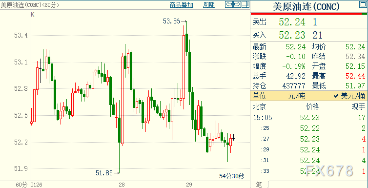 NYMEX原油期货下跌0.17%至52.23美元/桶;ICE布伦特原油期货上浮0.13%至55.17美元/桶。