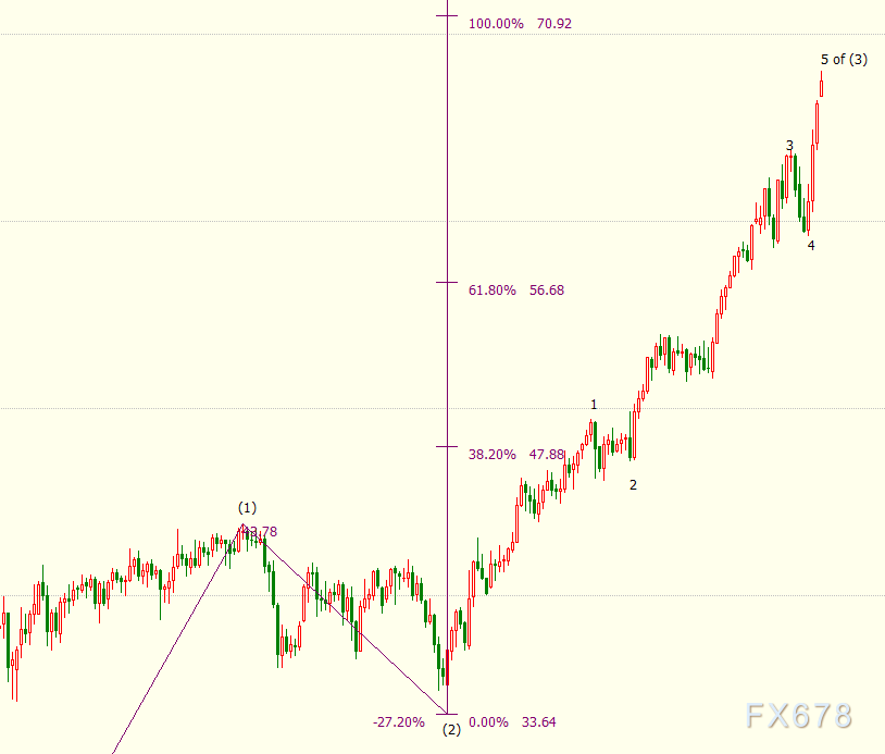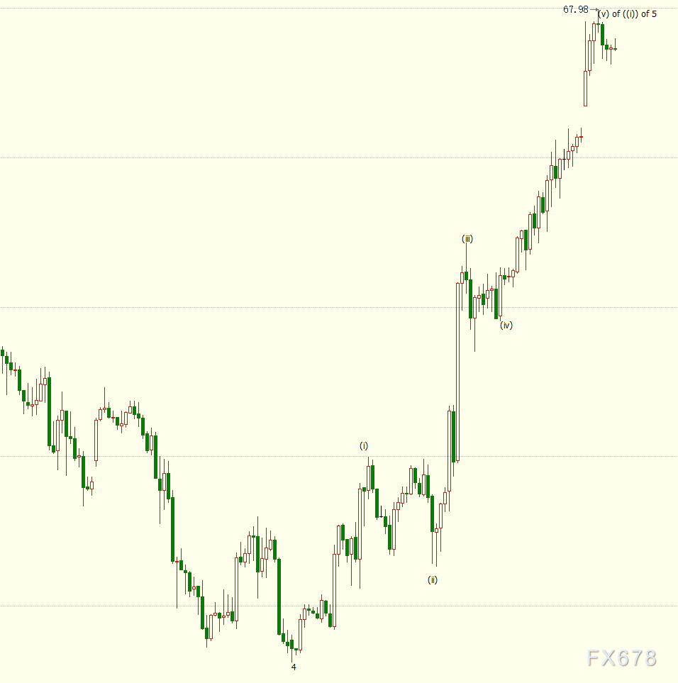 小时图上看,油价处于自63.82美元开启的上行(v)浪。(v)浪是自59.25美元开启的上行((i))浪的子浪,((i))浪则隶属于5浪。预计油价将很快迎来((ii))浪回调走势。