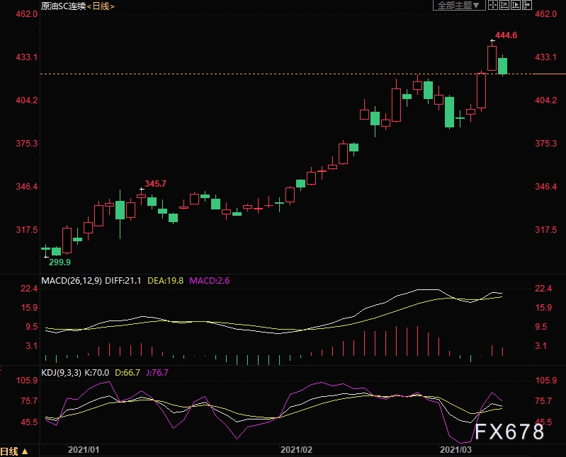 周二(3月9日)上海原油价格大跌,主力合约2104终盘收于422.7元/桶,跌10.9元/桶,跌幅2.51%,油市此前连续的大涨导致市场出现恐高情绪,多头选择获利了结。新航财富管理公司首席市场策略师Colin Cieszynski表示,石油价格近期涨势看好,但短期存在超买。他补充,近期美元开始回弹,也导致大宗商品普遍价格回跌。