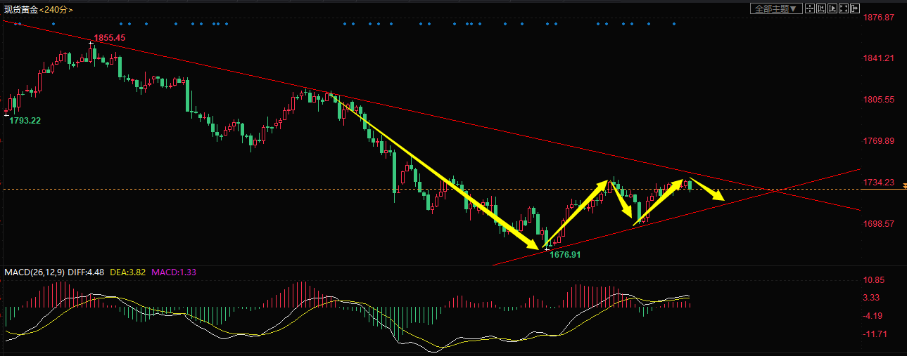 周二(3月16日)现货黄金于亚市下午盘初期升至1737.29,随后金价出现跳水...从行情涨过昨日高点的趋势来看,黄金短线走势应该还算正面,不过1740上方的压力位变化不大,趋势上黄金还是属于下跌趋势,所以我们操作上也应以顺势高空为主。