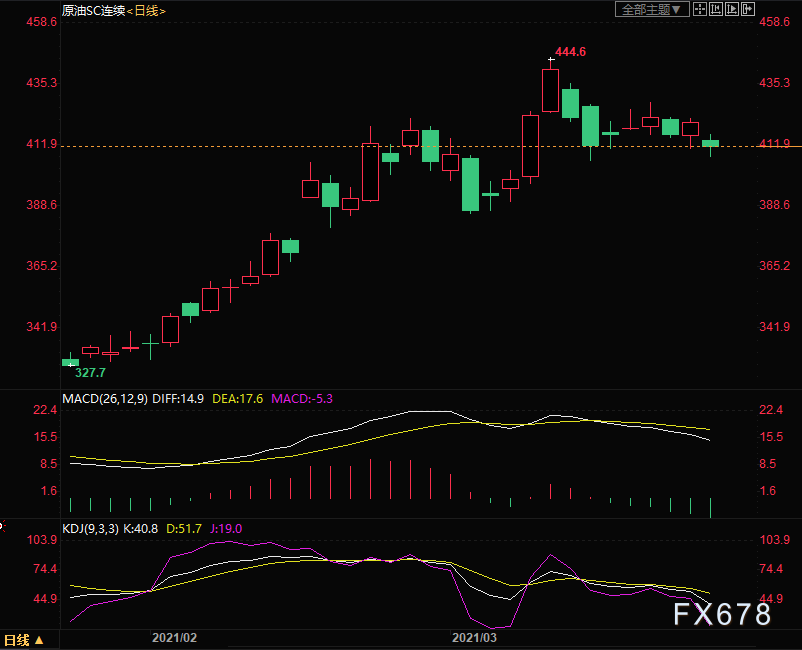 上海原油价格小幅下跌,主力合约2105终盘收于411.5元/桶,跌4元/桶,跌幅0.96%。
