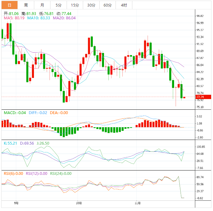 未来油价仍倾向于沿着布林线的下轨向下运行。KDJ最初一直处于低位,上一交易日录得长下影线十字星。如果本交易日录得阳线,需要警惕触底的可能性。初始阻力位在5日均线81.54附近,10月21日低点和周五高点的阻力位在82.62附近。如果能恢复这一位置,将增加短期看涨信号。
