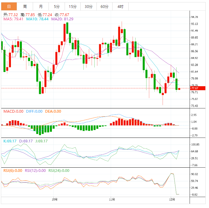 周二早盘,美油交投于77.60美元/桶附近,油价周一下跌超3%,追随美国股市跌势,此前美国服务业数据强劲引发了对美联储可能继续其激进的政策紧缩路径的担忧,此外,沙特下调1月对亚洲的阿拉伯轻质原油官方售价也拖累油价。