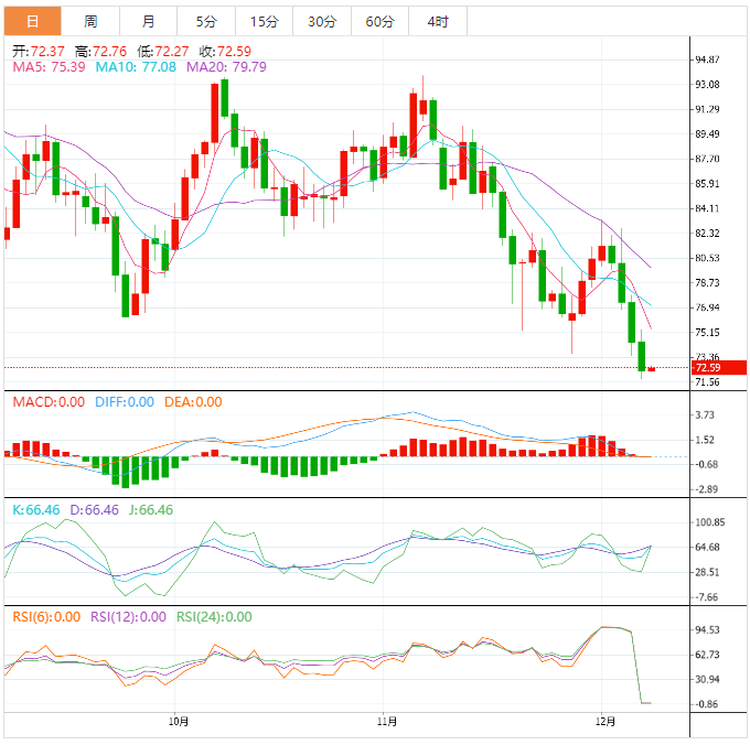 从近期原油的表现,整体处于下行趋势,但是过程迂回反复。波动基数大,在下跌的过程中,反弹修正的幅度也不小。4小时图从83.30高点承压以来,本周一波式连阴回撤将上周反弹空间全部回吐,直接跌至低位,目前在上周低点附近轻微震荡,可能一个假性的反弹修正,但后市依旧是蓄势下破的走法,只是时间问题。1小时图小级别的二浪台阶延续了下行,昨日在77.80横向整理承压后再放量。小时图二浪释放之后,今日的持续性是一个关键,是进一步放量下行还是震荡横盘,是决定强弱延续的走法。综上所述,反弹高空为主,回踩低多为辅,上方短期关注74.8-75.3一线阻力,下方短期关注71.0-70.5一线支撑。