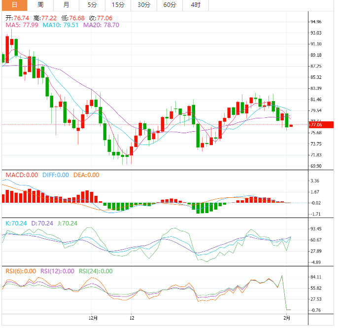 截至发稿时,WTI原油日收盘价低于50日移动均线,约为77.75美元,这将引导WTI原油走向两个月来的支撑线,最晚接近75.25美元。