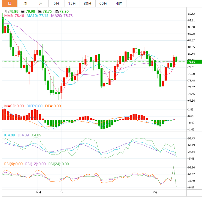 WTI原油价格仍然徘徊在一周支撑线和100日移动均线之间,分别接近78.80美元和80.90美元。