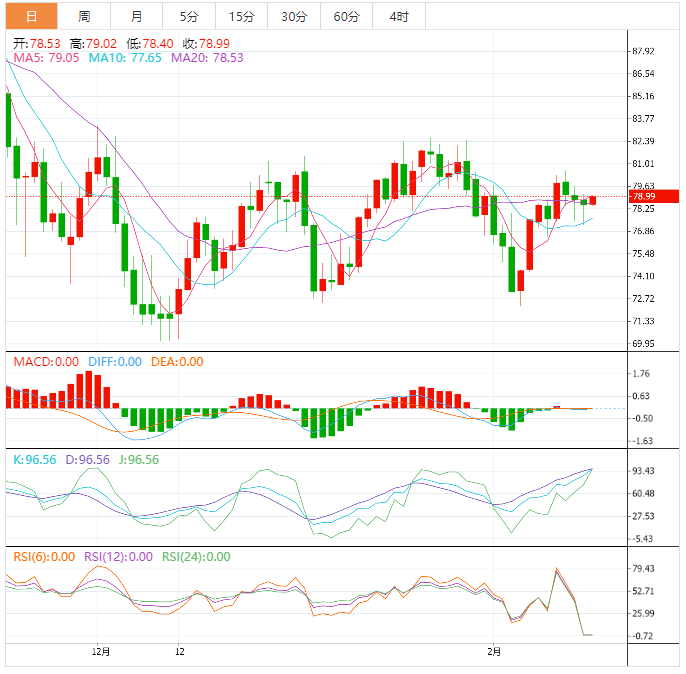 78.98美元/桶附近;油价周三微跌,美国原油和汽油库存上周飙升,美元走强,且投资者担心利率上升将使经济放缓并打击燃料需求;但跌幅有限,市场考虑到是数据调整导致美国原油库存大增,且国际能源署(IEA)上调全球石油需求增长预测。