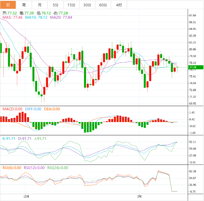 38.2%的水平接近76美元/桶的中间通道区域,然后50%的水平与75.57美元/桶的波动低点一致。