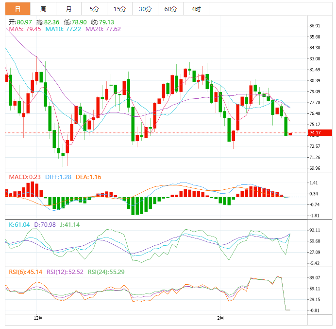美联储加息预期提振美元走强打压油价,美国原油库存猛增再为空头助力,加之受冬季风暴影响,美国上千架次航班被取消,增加需求担忧,油价下行空间较大,有望触及70美元/桶。