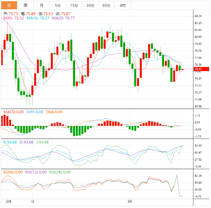 技术面上,短线油价面临进一步下行风险,布林线下轨支撑目前在73.18附近,2月6日低点支撑在72.24附近,该位置支撑较强,需要予以关注,进一步强支撑在70整数关口附近,如果跌破该支撑,则增加中线看空信号。上方75.05位置目前已经转化为初步阻力所在,收复该位置前,后市偏向空头;5日均线阻力在75.53附近,10日均线、21日均线和55日均线目前都在77.24附近,需要收复该位置,才能扭转油价跌势。