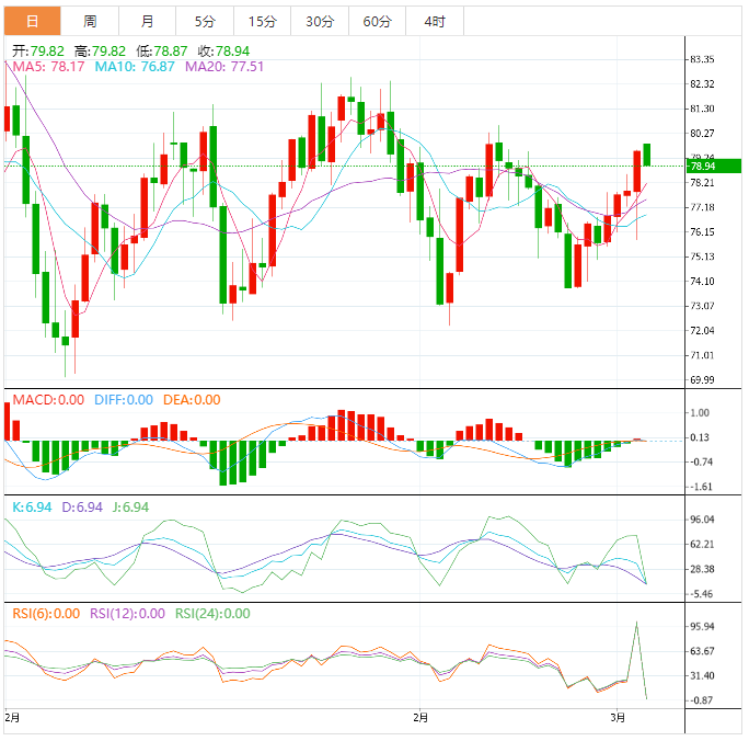 WTI原油在连续四天上涨后重新回到了空头的视线中,这一能源基准从三周高点出现180度大转弯,周一盘中在79.30美元附近盘中下跌0.70%。