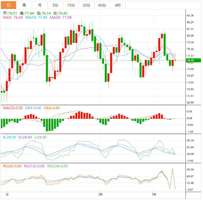 由于油价短线持续走弱,油价近几个月仍处于宽幅震荡走势,也需要提防油价探底回升的可能性,上方初步阻力在上周五低点75.84附近,5日均线阻力在76.97附近,55日均线阻力在77.75附近,若能收复该位置,则削弱后市看空信号。综合来看回踩低多为主,反弹高空为辅,上方短期关注78.4-78.9一线阻力,下方短期关注75.8-75.3一线支撑。
