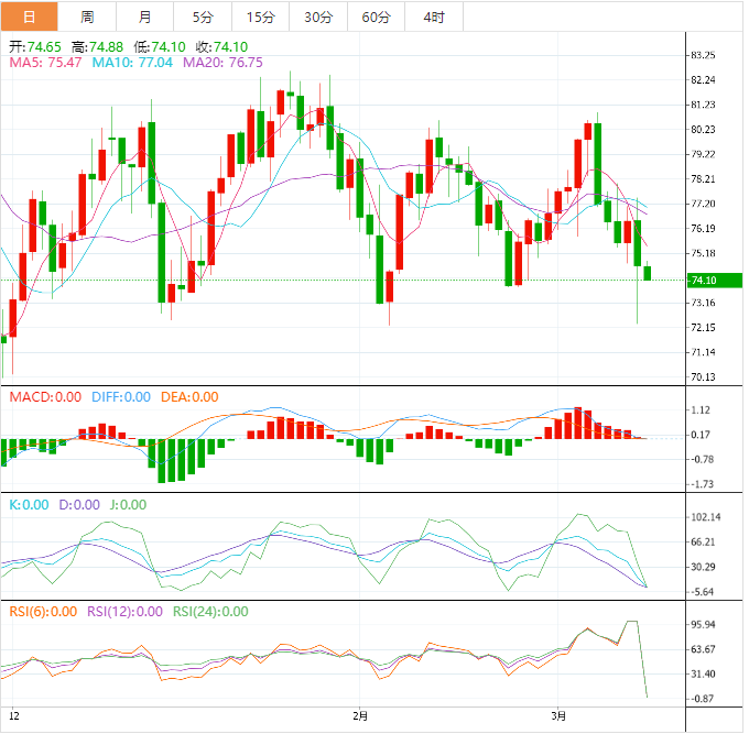 周二亚洲时段,美油交投于74.50美元/桶附近;油价在周一的波动交易中下跌超2%,由于硅谷银行的倒闭搅乱了股市并引发了对新的金融危机的担忧,但需求的恢复提供了支持,且沙特阿美认为,石油市场中短期内将保持紧张平衡。