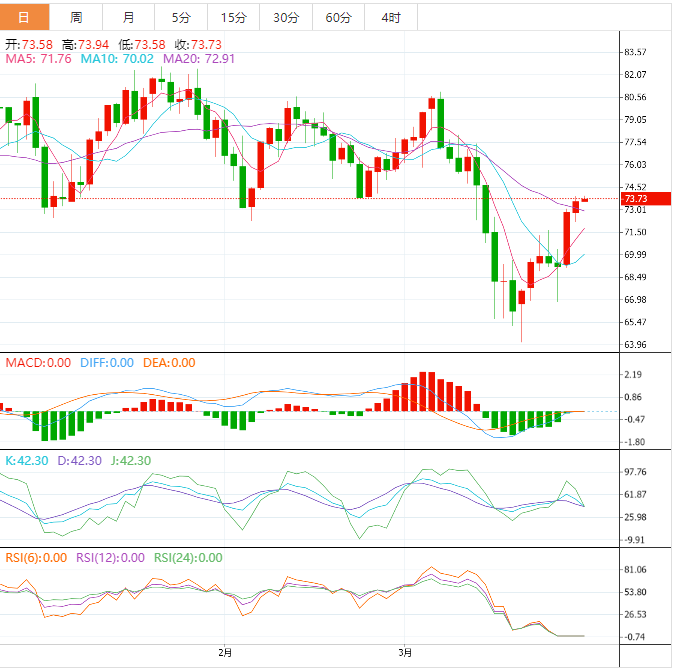 周四盘中,美油交投于73.75美元/桶附近;油价周二攀升,延续上日伊拉克库尔德斯坦供应中断的风险以及对银行业动荡得到遏制的希望带动的大涨趋势,早间公布的API数据显示库存减少,加之地缘紧张,诸多利好提振油价。
