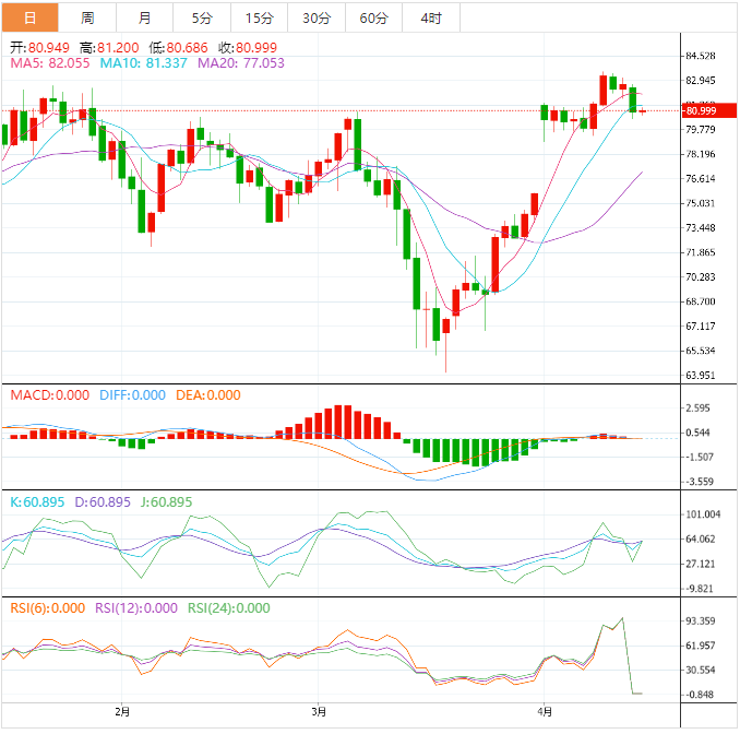 周二亚洲时段,美原油交投于80.82美元/桶附近;油价周一下跌超2%,因为美元走强,而且投资者在考虑美联储可能在5月份加息的问题,这可能会抑制经济复苏的希望,另外俄罗斯预计石油产量将保持稳定直至2025年,美国页岩气产量或于5月创历史新高,拖累油价。