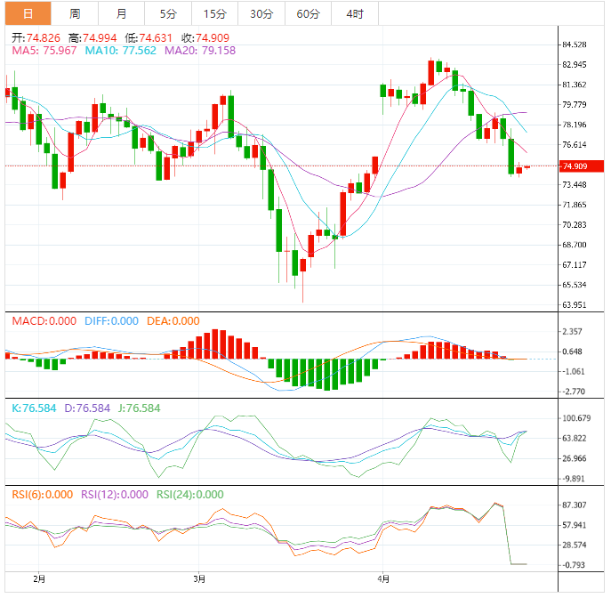 技术面上,油价之前受到100日均线支撑反弹,但隔夜再度回落至100日均线附近,并一度下破该支撑,逼近74.0附近,暗示上方卖压较强,短线下行风险有所增加,留意短期73.0附近支撑,如果失守该这次,则增加后市看空信号;上方初步阻力在5日均线77.63附近,21日均线阻力在78.91附近,10日均线阻力在79.39附近,若能顶破该阻力,则削弱后市看空信号,进一步阻力参考80整数关口。