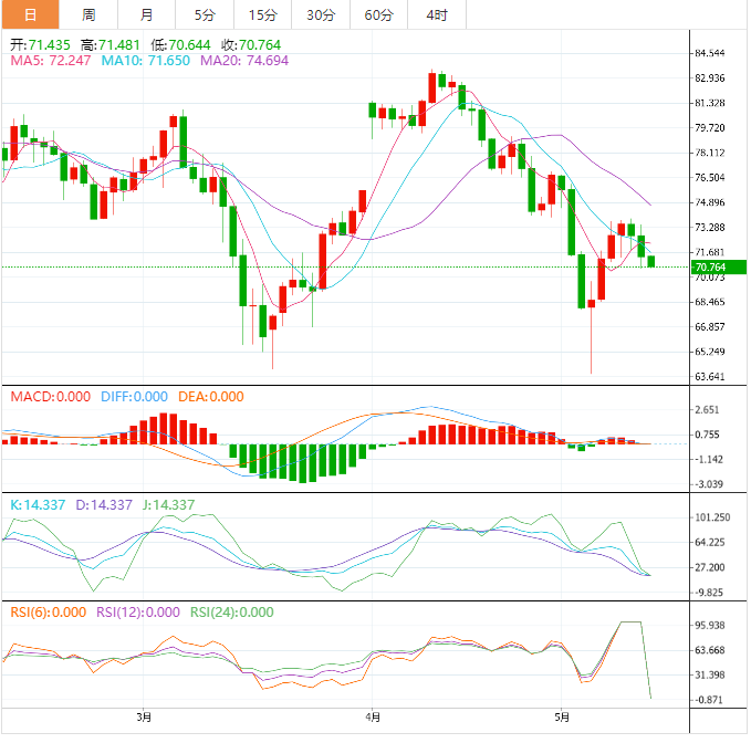 周五亚洲时段,美原油交投于70.76美元/桶附近;油价周四下跌约2%至一周低点,因为美国债务上限的政治僵局激起了对全球最大石油消费国经济衰退的不安情绪,而美国初请失业金人数的增加和亚洲经济数据的疲软也对油价造成打击。
