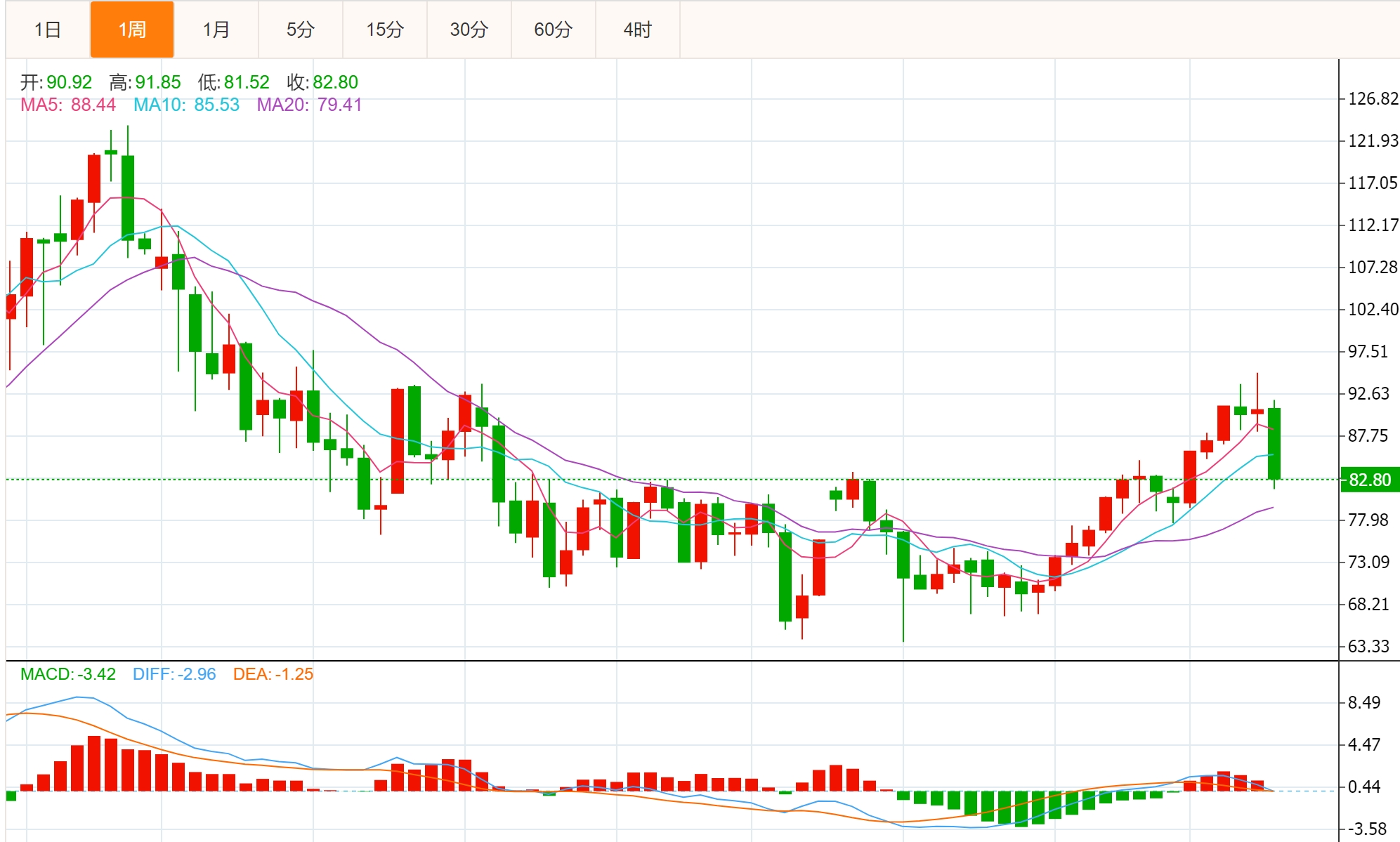 原油价格周三创下一年多来最大单日跌幅,此前数据显示需求弱于预期。 周四,由于担心全球经济增长放缓将削弱消费,油价继续下跌,尽管有消息称沙特连续第五个月上调面向亚洲客户的旗舰原油价格。 然而,周四WTI原油收于每桶82美元附近,自去年7月以来首次跌破50日移动平均线。 在短短六个交易日内下跌了13.5%。 此前,数据显示美国汽油库存激增,导致汽油期货价格暴跌。 原油最新行情走势—— 原油再次上演重冲高回撤走势,最高点给到了83.0美元一线遇阻,最低点触及81.5水平企稳震荡。