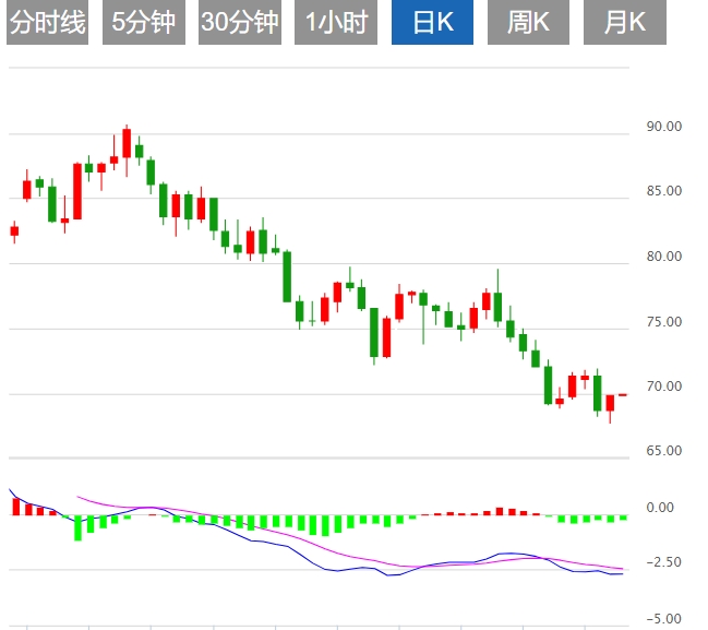 周四亚盘,WTI油价冲高回落,现交投于69.80附近。由于能源市场普遍担心全球原油需求下滑将继续削弱石油输出国组织(OPEC)的减产力度,原油价格的持续回落使WTI油价跌至68美元附近。