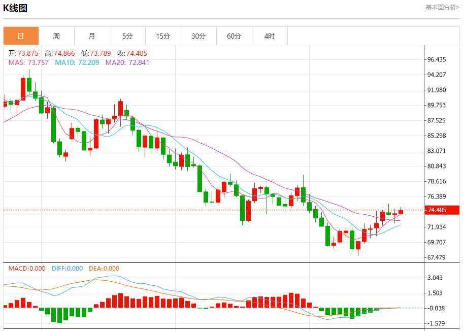 技术点评:在73.80之上,为多头信号,向上的目标位为75.35。
