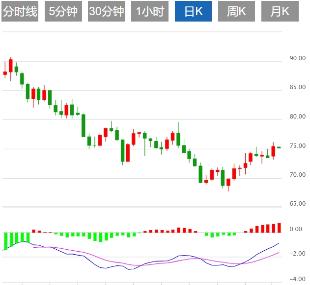 周三亚盘,美原油走低,现报75.24附近,因红海船只进一步遭受袭击引发了人们对航运中断的担忧,以及人们对降息的希望,以促进经济增长和燃料需求,油价上涨逾2%,盘中一度创近四周新高至76.16美元/桶。