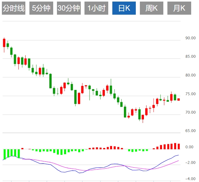 周四欧盘,美国原油基准西德克萨斯中质原油(WTI)盘中交投于74.30美元附近。美元走软支撑了WTI原油价格的回升,这为以美元计价的大宗商品提供了一些支撑。