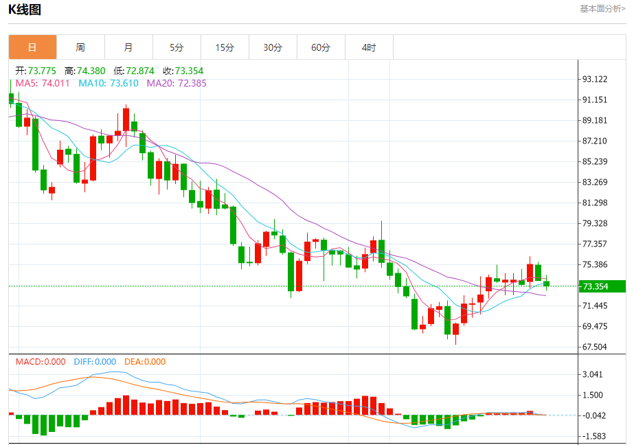 周四盘中,WTI原油报73.329,跌幅0.63%。