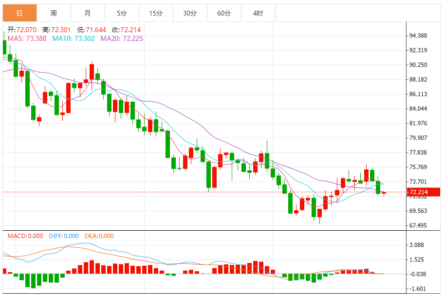 原油昨日中阴线收低,日线连续两个交易日的中阴线收盘,打破了此前的整理上扬格局。同时将周初的上涨中阳线的空间尽数回吐,跌破了小区间低点72.30.日线收低,短线重新走回落,今日周线收官。第三周的收盘至关重要。收回阴线则重新回落。4小时图失守中轨后依托中轨做为阻力承压震荡下行,打破了周初的整理区间下轨,今日短线先看延续性回落。