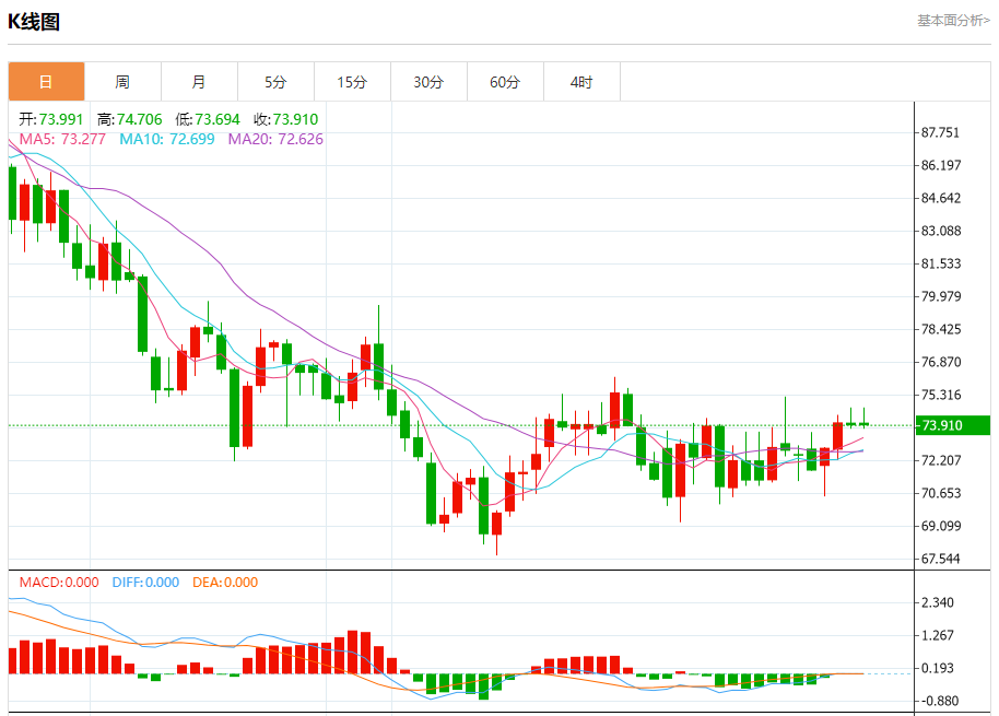 周五盘中,WTI原油报73.999,跌幅0.01%。