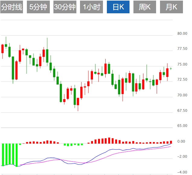技术上,由于市场WTI油价双向波动,WTI油价在中线附近徘徊,WTI在74.00美元附近测试震荡区域。 自11月初跌至该水平附近以来,WTI油价处在关键阻力附近,维持窄幅震荡,经过这番震荡后,50日简单移动均线下降接近盘中区域。