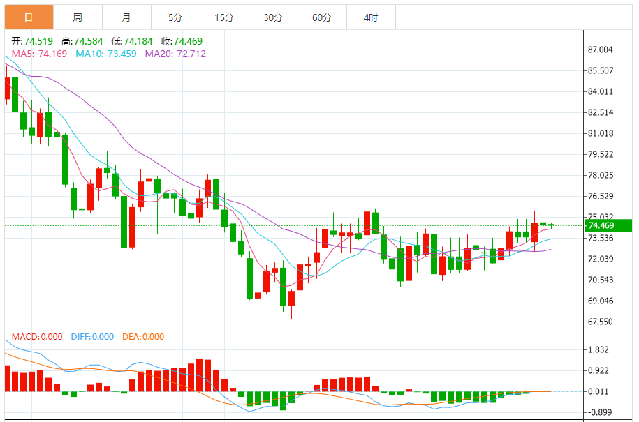 今天的预期交易范围:在73.00支撑位和76.00阻力位之间