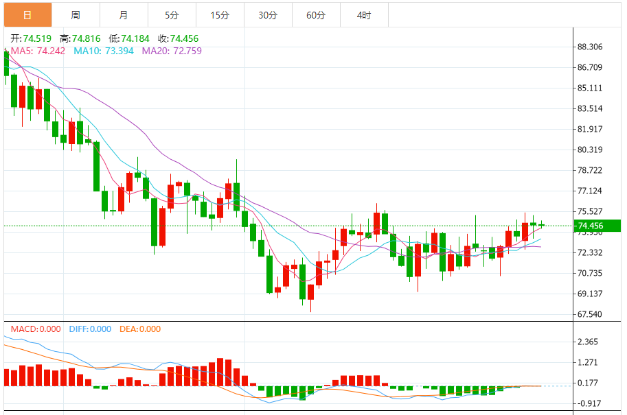 周三(1月23日),原油价格交投于74.45美元每桶附近,油价周二盘中继续大幅震荡,最终小幅收跌。