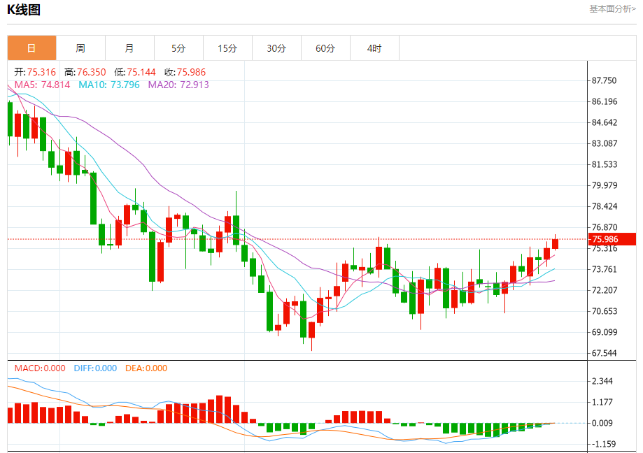 技术点评:在75.40之上,为多头信号,向上的目标位为76.70。