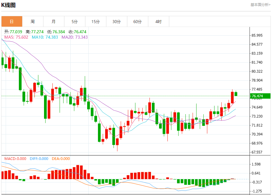 周五盘中,WTI原油报76.594,跌幅0.63%。