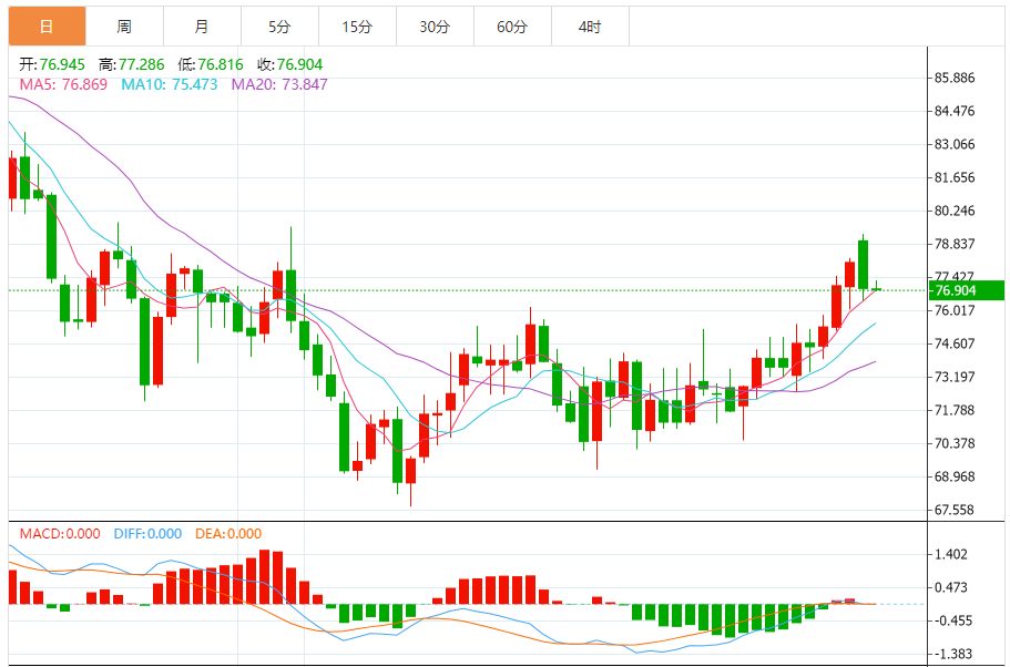今天的预期交易范围:在75.20支撑位和78.00阻力位之间