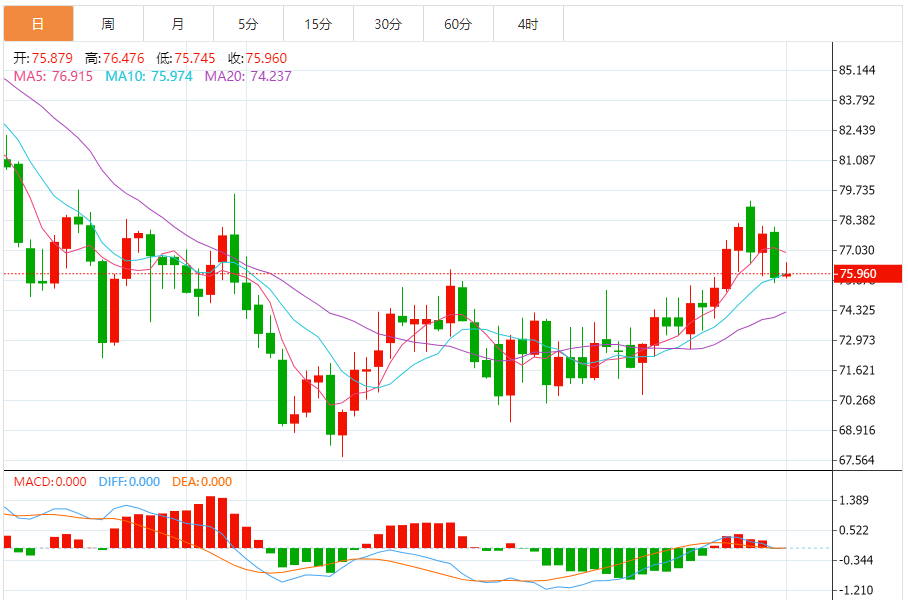 4小时级别走势上价格走出前期的低位震荡之后关注下有没有回踩之后的延续拉升走势。今日短线以75.0做临界点逢低多。4小时图回至下国稳,目前构造台阶上升通道当中,下轨支撑有效,今日只要不再下破75.0低点,将依托此位做次低点构造台阶上升通道。短期来看,原油将继续维持拉锯震荡,震荡行情,关键在于进场点位的切入,把握高空低多对待。