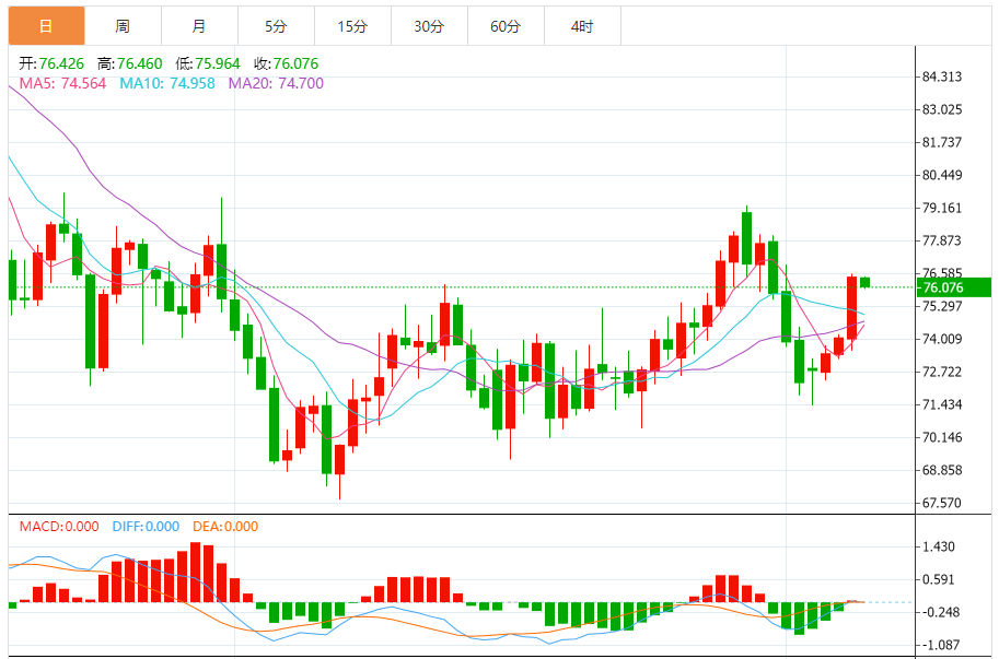 今天的预期交易范围:在75.00支撑位和78.00阻力位之间