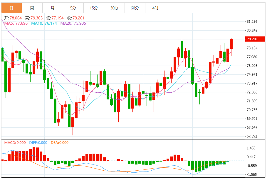 今天的预期交易范围:在77.00支撑位和79.80阻力位之间